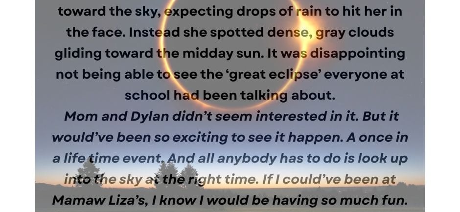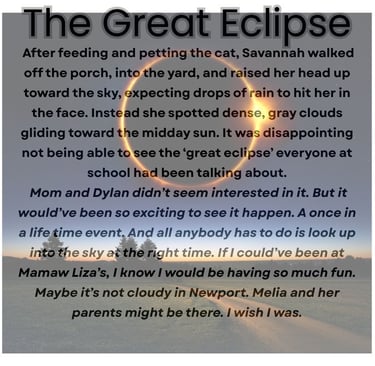 After feeding and petting the cat, Savannah walked off the porch, into the yard, and raised her head up toward the sky, expecting drops of rain to hit her in the face. Instead she spotted dense, gray clouds gliding toward the midday sun. It was disappointing not being able to see the ‘great eclipse’ everyone at school had been talking about.